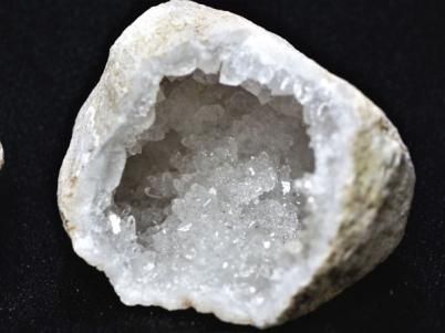 外観は何の変哲もない只の白っぽい石なのですが、内側は粉砂糖のような水晶の結晶でビッシリと覆いつくされています。