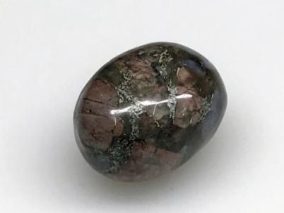 色は全体的に緑がかったグレーがメインで、淡いピンクや白っぽいブルーがちりばめられた様なモザイク状の石です。混合鉱物の為、原石の比重や硬度は一定ではありません。